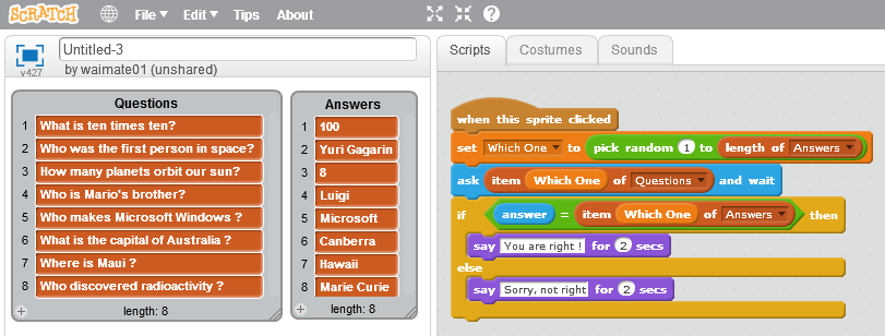 When the sprite is clicked, it chooses a random number, asks a question, and checks to see if your answer matches the corresponding answer. For example, if the random number was 6, it would ask question number 6 and check that whatever you typed matches answer number 6.