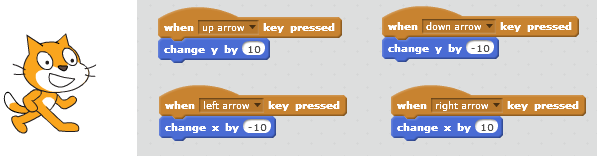 Most Scratchers will have started with the standard Cat sprite, and some script that looks like this, letting you drive your sprite around in response to keystrokes.