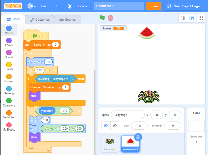 - Also hide the melon once it's touched the bug, otherwise the score will keep rocketing up for the whole time the melon is passing the bug