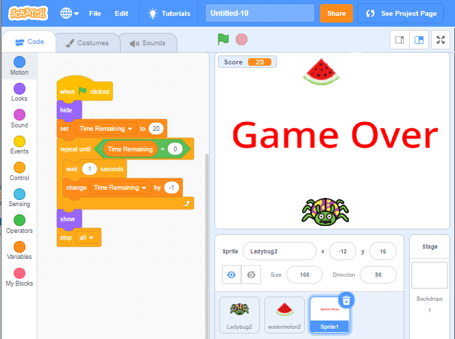 - When Time Remaining gets to zero, display the sprite and stop all the scripts