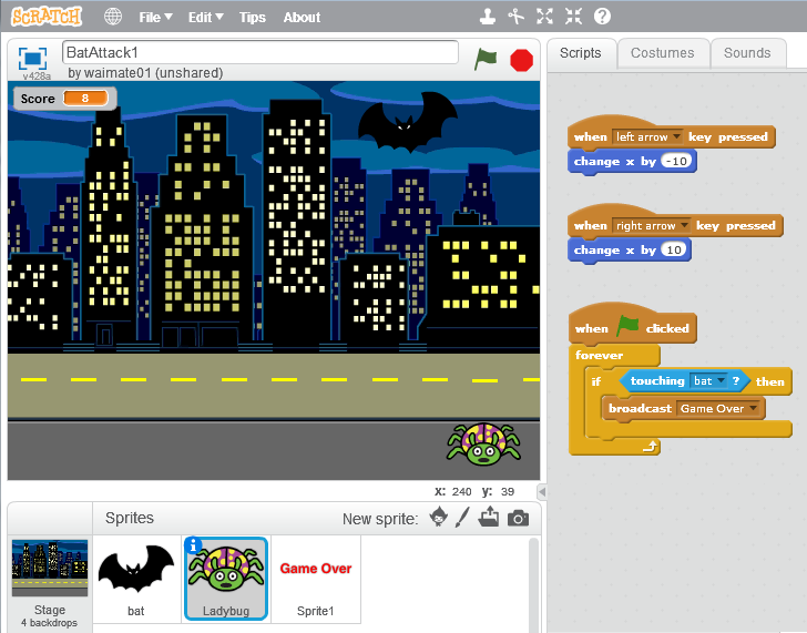 We also add a forever loop, and if the bug is ever touching a bat, we broadcast a message to let all the other sprites know the game is over.