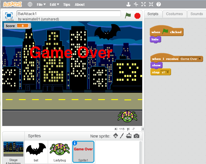 This sprite simply hides itself when the game starts, and reappears when it receives the "game over" broadcast message.